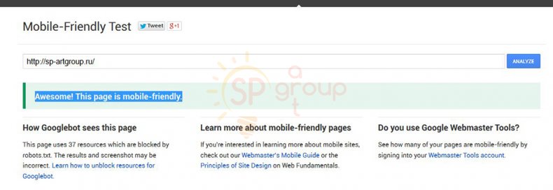 Сервиса проверки на оптимизацию для мобильных устрвойств, порадовал приятным ответом: Awesome! This page is mobile-friendly.