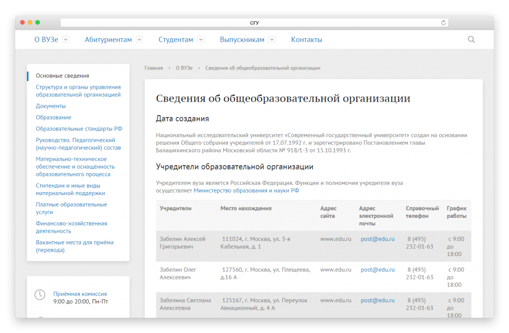 В соответствии с новыми требованиями Рособрнадзора (Приказ №785 от 29.05.2014), сайт каждого образовательного учреждения должен иметь раздел с полными сведениями об организации. Раздел должен содержать подробную информацию о школе или вузе, филиалах, преподавателях, руководстве, предметах и спецкурсах, вакантных местах для поступления, информации для абитуриентов и студентов и другом.