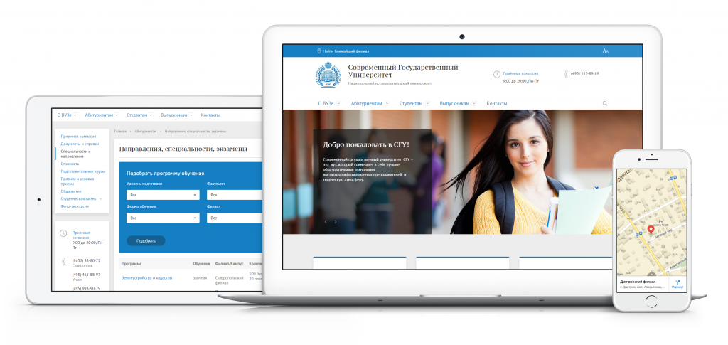 Сайты образовательных учреждений адаптированы под мобильные устройства, а также имеют умные фильтры для поиска необходимой информации.