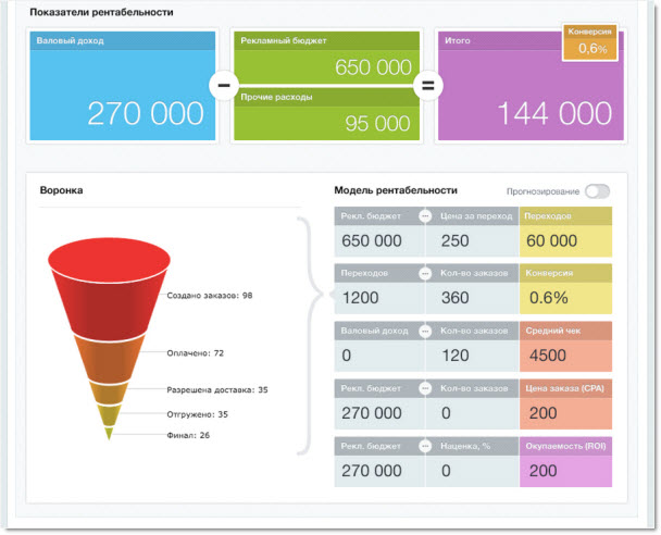 Бизнес-модель интернет-магазина. В платформе включен аналитический инструментарий, который позволяет оценить эффективность работы интернет-магазина: его прибыльность, какова цена перехода и средний чек. Владелец сайта может, изменяя ключевые параметры проекта, прогнозировать прибыль, таким образом определяя наиболее оптимальные показатели.
