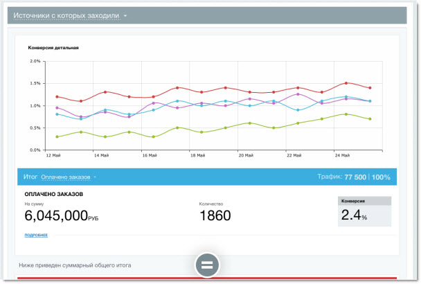 Пульс конверсии. Конверсия — основной показатель качества работы интернет-проекта. Увидеть конверсию сайта теперь можно в режиме реального времени. В новой версии появился инструмент, который показывает конверсию сайта за выбранный период времени и аналитику по каждому из каналов привлечения клиентов: контекстной рекламы, SEO, триггерных рассылок и мобильного трафика. Конверсию также можно оценить для пользователей в зависимости от типа устройств — компьютера, планшета или смартфона. Результат отображается в «пульсе конверсии» — индикаторе изменения конверсии сайта.