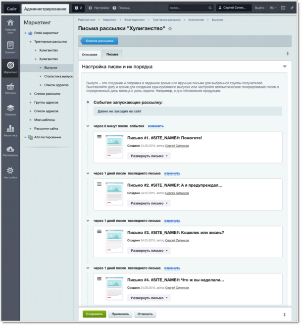 Триггерные рассылки. Для любого интернет-проекта важно не просто привлечь новых покупателей, но и удержать существующих. В новом «1С-Битрикс: Управление сайтом 15.5» появился удобный инструмент взаимодействия с посетителями сайта — автоматизированная система триггерных рассылок, увеличивающая количество возвратов и повторных покупок в магазине. В продукте реализовано семь готовых сценариев триггерных рассылок: брошенная корзина, отмененный заказ, повторные заказы и 4 вида рассылок для клиентов, не заходивших в магазин в течение 90, 111, 180 и 365 дней. Для каждого сценария можно один раз настроить шаблон письма, и письма будут отправляться автоматически каждому пользователю, если он попадает в одну из категорий. Эффективность каждой рассылки может быть проанализирована.