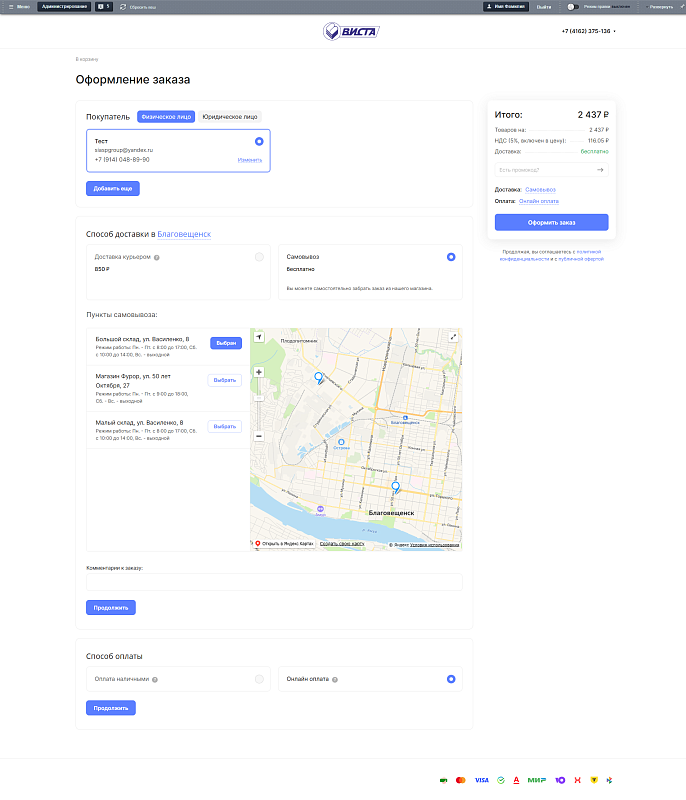 внедрение и настройка полного цикла онлайн-продаж: корзина, выбор услуг, расчёт стоимости доставки, онлайн-оплата через интегрированный платежный шлюз;